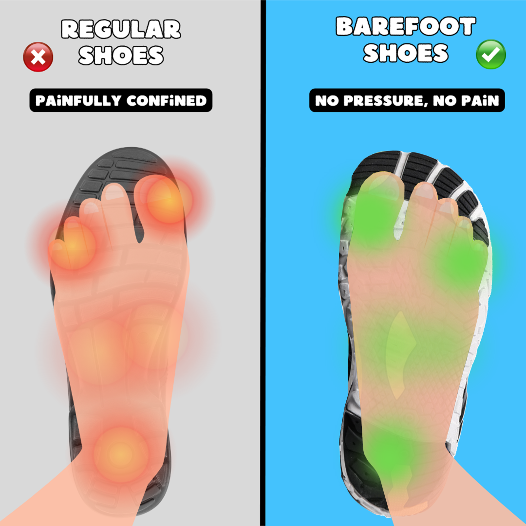 Conventional shoes like sneakers or boots are often uncomfortable, squeeze your toes, and rely on thick, rigid soles that weaken your muscles over time. This leads to pain in your calves, sore feet, and even strain in your back after long walks.